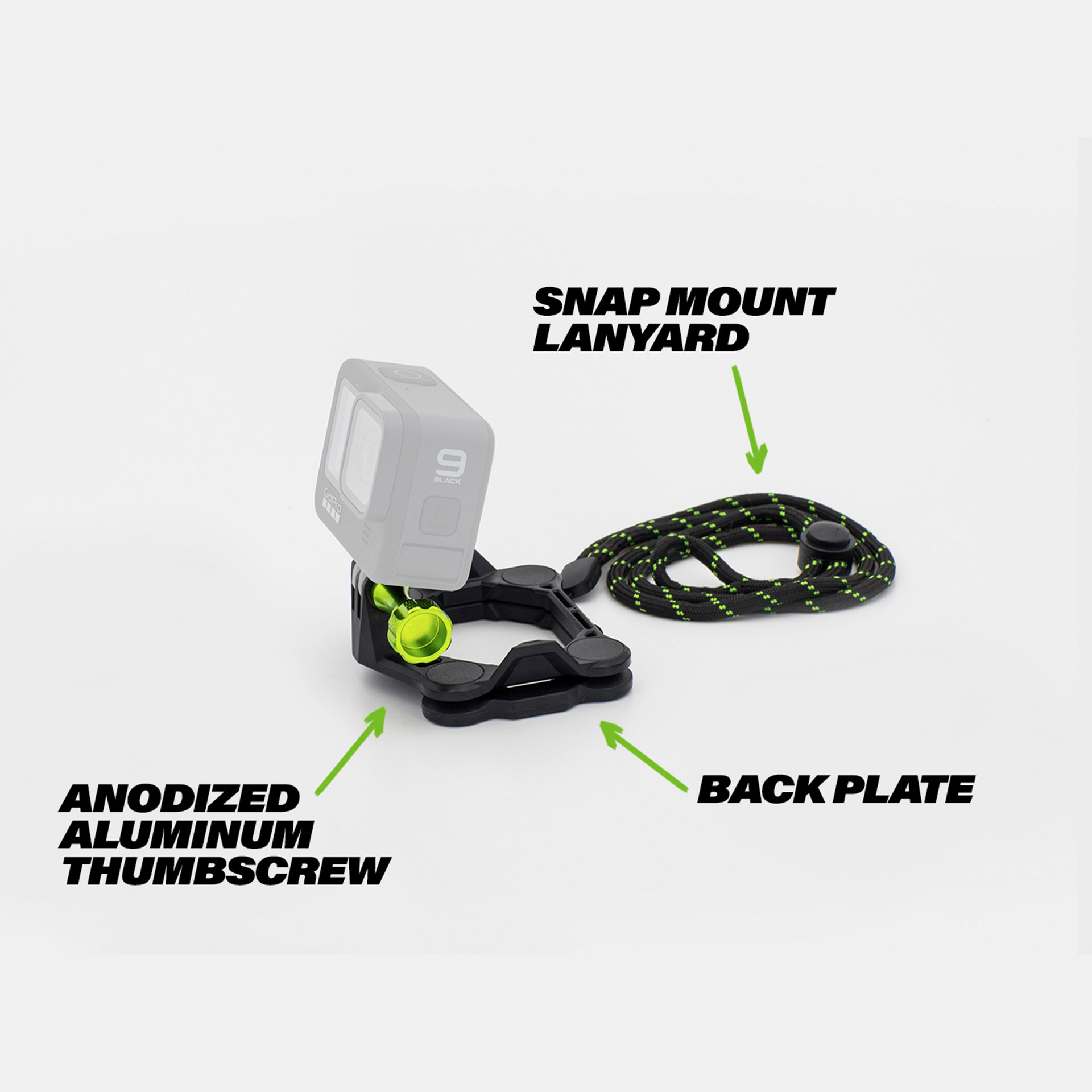 • Includes SNAP Mount, Back Plate, SNAP Mount lanyard and anodized aluminum thumbscrew